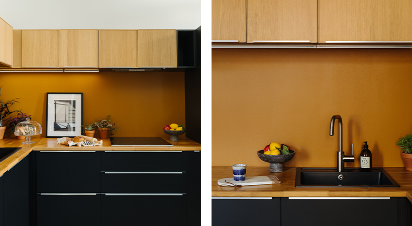 La teinte Casse-Noisette, remise en cause dans un premier temps, s'est avérée judicieuse car elle tranche avec le noir des meubles tout en s’intégrant parfaitement avec le bois des éléments hauts de cuisine, le plan de travail ainsi que le parquet. Cette couleur a la faculté de changer à la lumière du soleil : elle tire vers un orange très sourd lorsque la lumière est frontale et redevient un marron caramel, plus grisé, lorsque la lumière s’estompe en fin de journée ou qu’elle est plus latérale. Cette subtile variation offre une ambiance dynamique à cet espace de vie et de partage, le faisant devenir lieu des mille et une discussions.