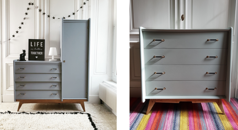 Le rose s'associe principalement avec des couleurs froides, comme le blanc, le beige, mais cela fonctionne également avec des couleurs métallisés tels que l'or, l'argent, le cuivre... Sur ces deux photos, on a appliqué le rose ballerine sur les deux commodes, en laissant apparent le bois des pieds du meuble. Sur la photo de droite, on a aussi teinté les poignées en couleur or, pour vous montrer la belle association que l'on peut faire avec les couleurs métallisés.
